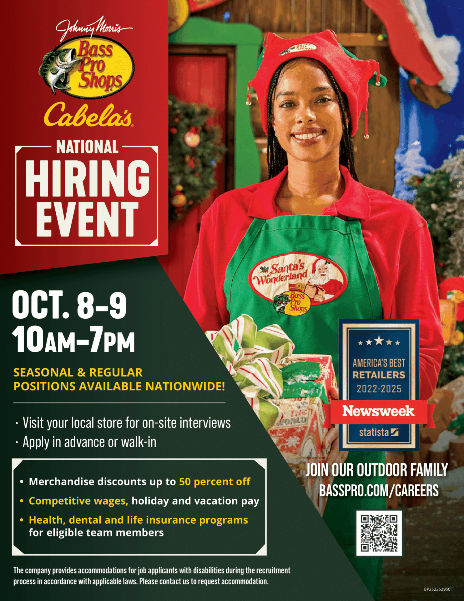 Posted on October 6, 2025 | News Updates Bass Pro Shops is hiring! The National Hiring event is happening on October 8th and 9th at all Bass Pro Shops across Canada. Visit your local store for on the spot interviews. Apply online at basspro.com/careers.